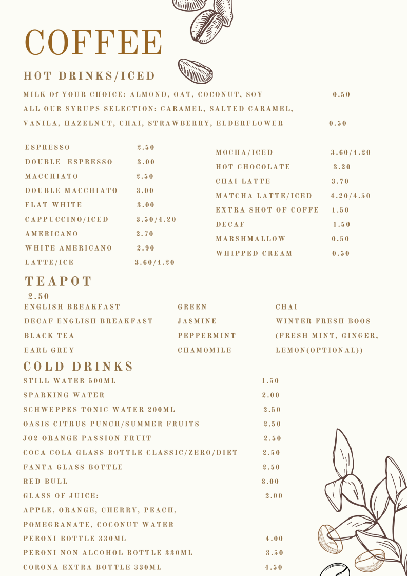 Those seeking a vibrant beverage can indulge in an array of teas, including classic English Breakfast or calming Chamomile, all at just £2.50. With options for alternative milks, your drink can be customized just the way you like it.